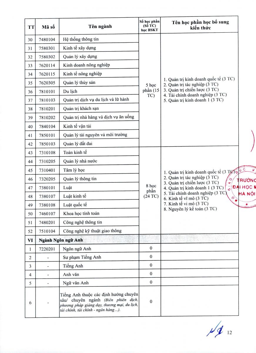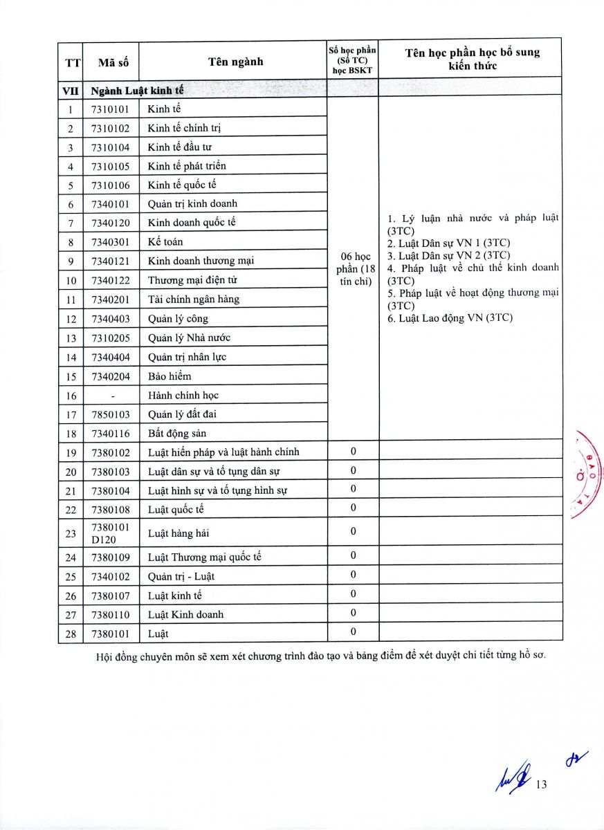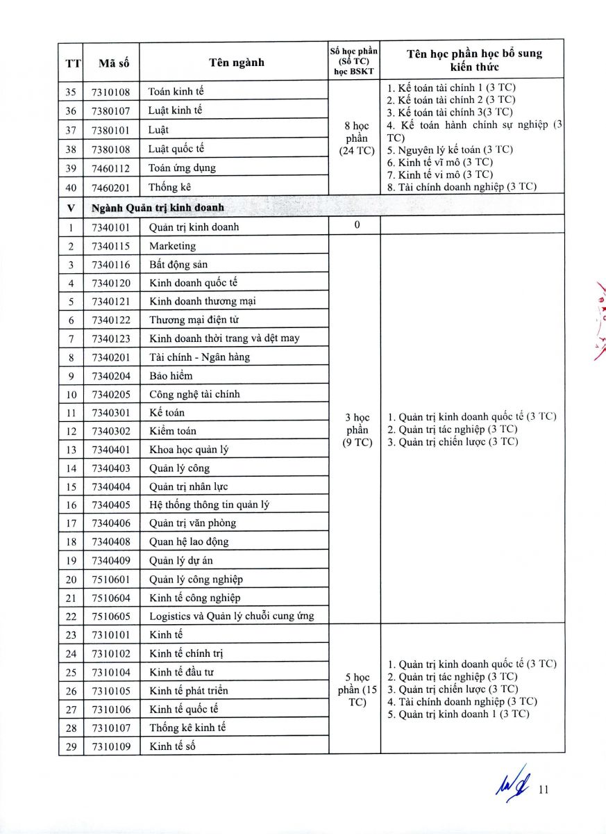 - Thí sinh có bằng tốt nghiệp đại học không nằm trong danh mục ngành phù hợp phải học bổ sung kiến thức (BSKT) ngành của chương trình đại học trước khi tham gia dự tuyển. Các học phần BSKT là các học phần trong chương trình đào tạo bậc đại học của ngành phù hợp với ngành thí sinh đăng ký dự tuyển đào tạo trình độ thạc sĩ. Tùy vào văn bằng đại học, chương trình đào tạo đã tích lũy, thí sinh phải học khối lượng các học phần BSKT cụ thể theo Danh mục ngành phù hợp quy định tại Phụ lục 1. Trường tổ chức mở các lớp học bổ sung kiến thức liên tục trong năm.