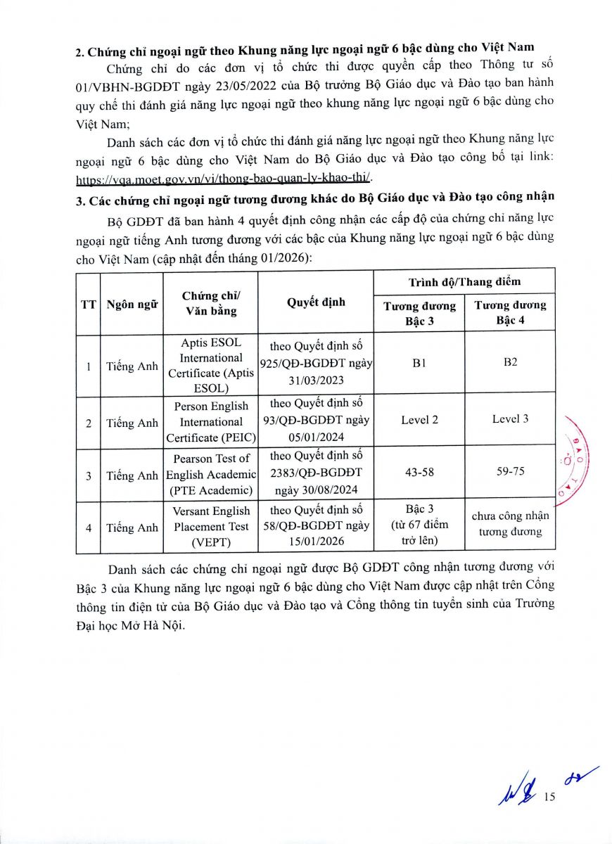 - Một trong các văn bằng hoặc chứng chỉ ngoại ngữ đạt trình độ tương đương Bậc 3 trở lên theo Khung năng lực ngoại ngữ 6 bậc dùng cho Việt Nam hoặc các chứng chỉ tương đương khác do Bộ GDĐT công bố, đã được cấp trong thời gian không quá 02 (hai) năm tính đến ngày đăng ký dự tuyển quy định tại Phụ lục 2. Trường yêu cầu ngoại ngữ đầu vào và ngoại ngữ đầu ra đối với mỗi người học phải cùng một ngôn ngữ.