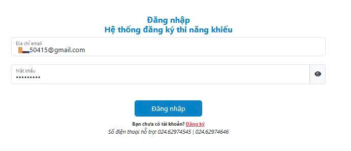 Tại đây thí sinh cần đăng nhập vào hệ thống với tài khoản và mật khẩu đã đăng ký (khi đăng ký dự thi năng khiếu).