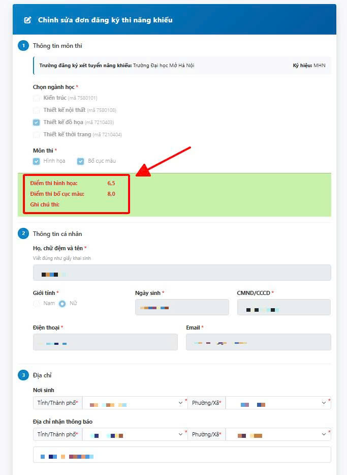 Kết quả thi năng khiếu vẽ của thí sinh sẽ được hiển thị như hình dưới đây: